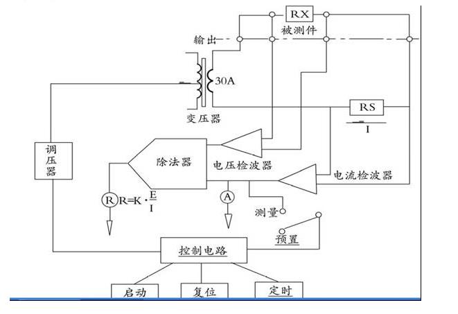 (3)接上負載,按一下“啟動”按鈕,調(diào)節(jié)“電流輸出”,來調(diào)節(jié)測試電流至規(guī)定值,即可進行測試,此時“mΩ”表將顯示被測件的電阻值。如果被測件電阻等于或大于電阻預(yù)置值,則儀器將超阻報警,蜂鳴器發(fā)出響聲,超限黃燈點亮,輸出電流被切斷,表示被測件不合格,按一下復(fù)位按鈕,解除報警,方可進行下次測試。如果測試電流超過30A,也會產(chǎn)生過流聲音警示現(xiàn)象。由于負載不完全一樣,測試時需調(diào)節(jié)“電流調(diào)節(jié)”至所需測試電流。