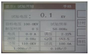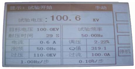 注意:手動控制加壓,不能快速旋轉(zhuǎn)調(diào)壓,調(diào)頻旋鈕,并選擇適當(dāng)?shù)牟竭M(jìn)值以免系統(tǒng)高電壓快速變化,產(chǎn)生過壓,對被試品,試驗(yàn)系統(tǒng)產(chǎn)生危害